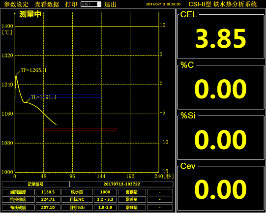 4、儀器檢測(cè):一定要確保澆入樣杯中的鐵水溫度(即澆樣溫度,儀器檢測(cè)界面上的最大溫度TP)在1280℃-1350℃,不能超過(guò)1370℃,否則會(huì)燒壞定碳杯(方杯、圓杯、澆注杯)。注意,這個(gè)最大溫度不是用測(cè)溫儀測(cè)量爐子中鐵水的溫度,爐子中鐵水的溫度應(yīng)該大于這個(gè)最大溫度100℃或者以上,因?yàn)殍F水在用取樣勺舀出過(guò)程中會(huì)降溫。爐前碳硅分析儀檢測(cè)操作熟練后,你也可以根據(jù)鐵水的碳含量適當(dāng)調(diào)整澆樣溫度,原則是:澆樣溫度大于初晶溫度(圖中TL)20度以上;碳含量高,初晶溫度低;碳含量低,初晶溫度高。